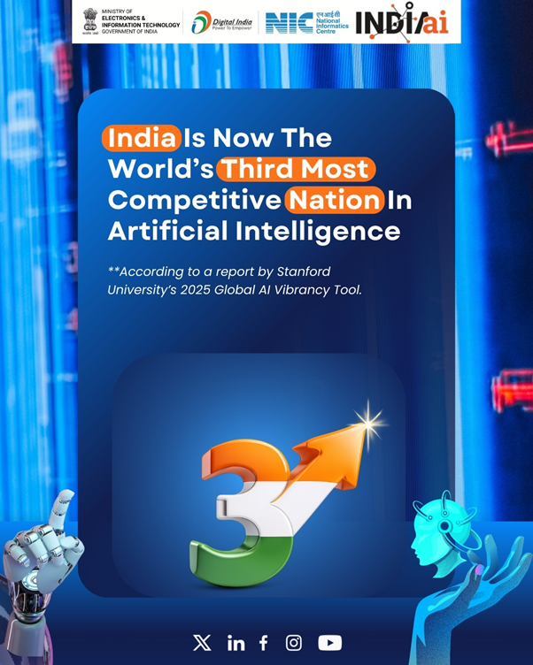 - India secured 3rd position globally in Artificial Intelligence competitiveness, according to a report by Stanford University’s 2025 Global AI Vibrancy Tool. This achievement underscores India’s rapidly growing AI talent, strong research capabilities, vibrant startup ecosystem, significant investment and economic impact, robust infrastructure, and effective policy & governance.